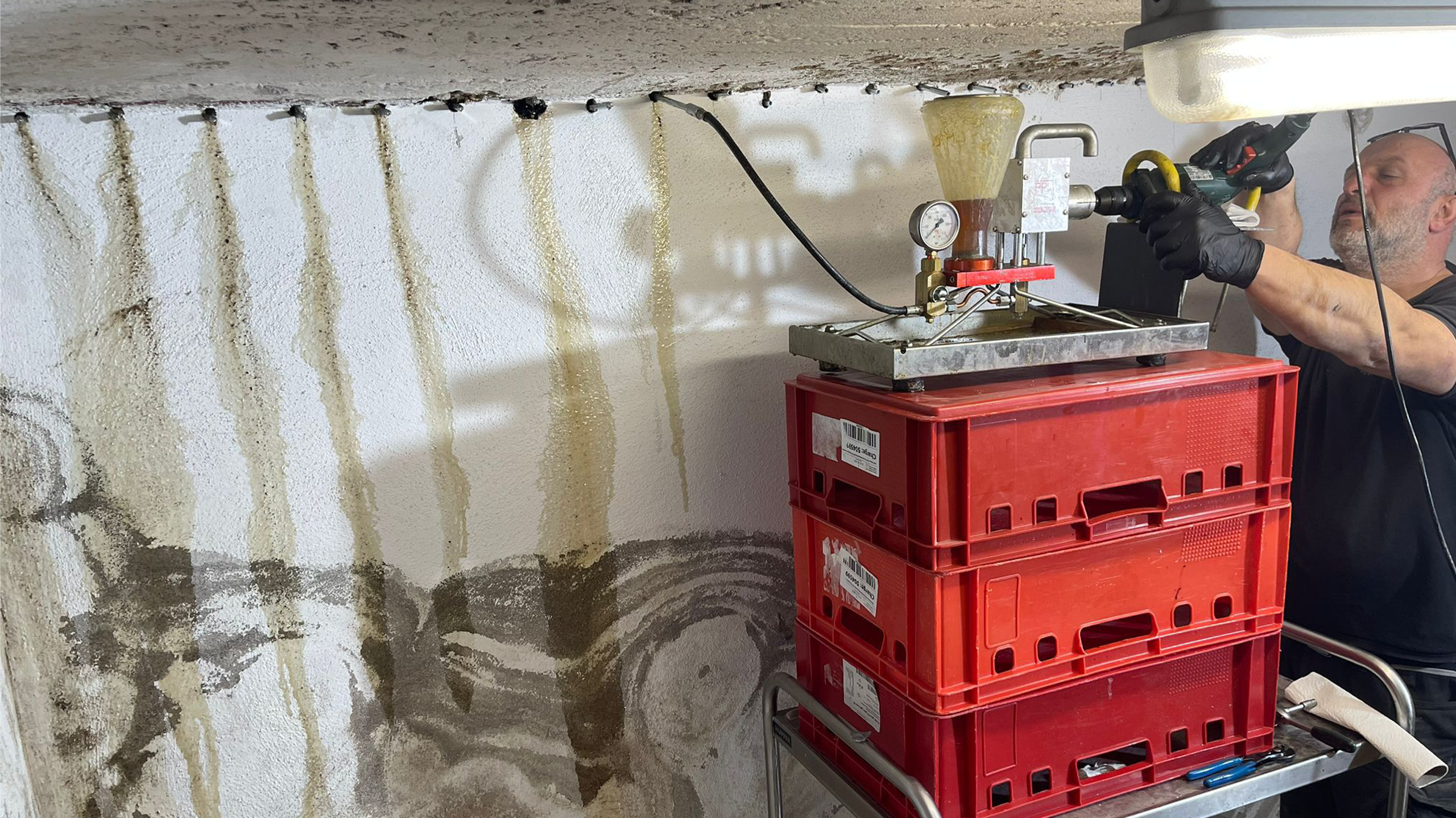 Risse in Beton und Mauerwerk werden mit Harz verpresst. So verhindern wir Feuchtigkeitseintritt und stellen die Stabilität wieder her.
